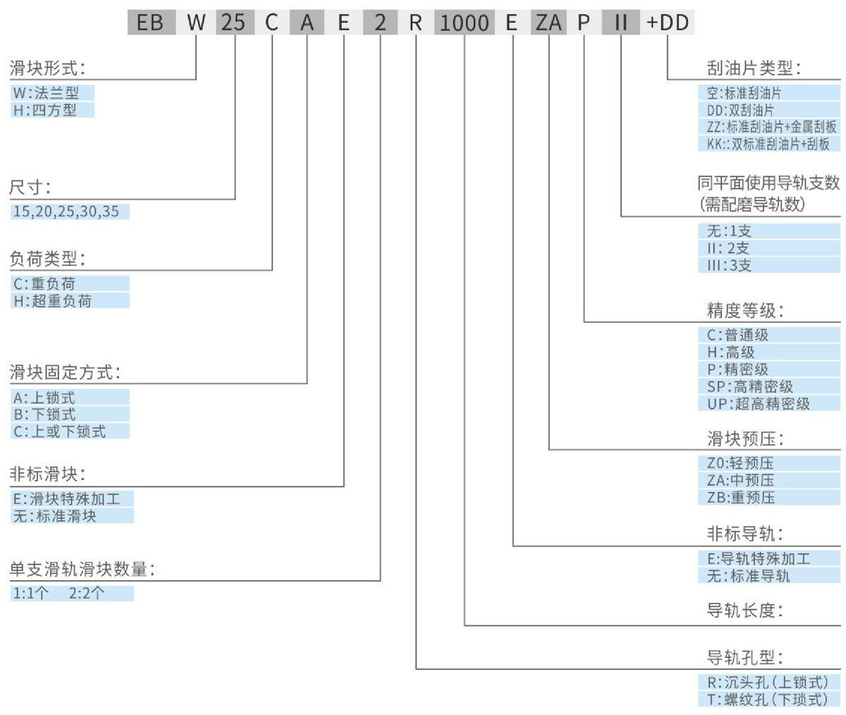 EB series use four rows of steel balls to bear the load design, so that it has high rigidity, high load characteristics, while having four directions and other load characteristics, and automatic centering function, can absorb the assembly error of the mounting surface, to get the high precision requirements; plus reduce the combination of height and shorten the length of the slider, very suitable for high-speed automated industrial machinery and space requirements of small equipment use. The slider is equipped with a ball retainer to prevent the ball from falling off, this design is not only convenient for customers to install the linear guide, when the slider is removed there will be no ball falling off, and the interchangeability is allowed under the accuracy.